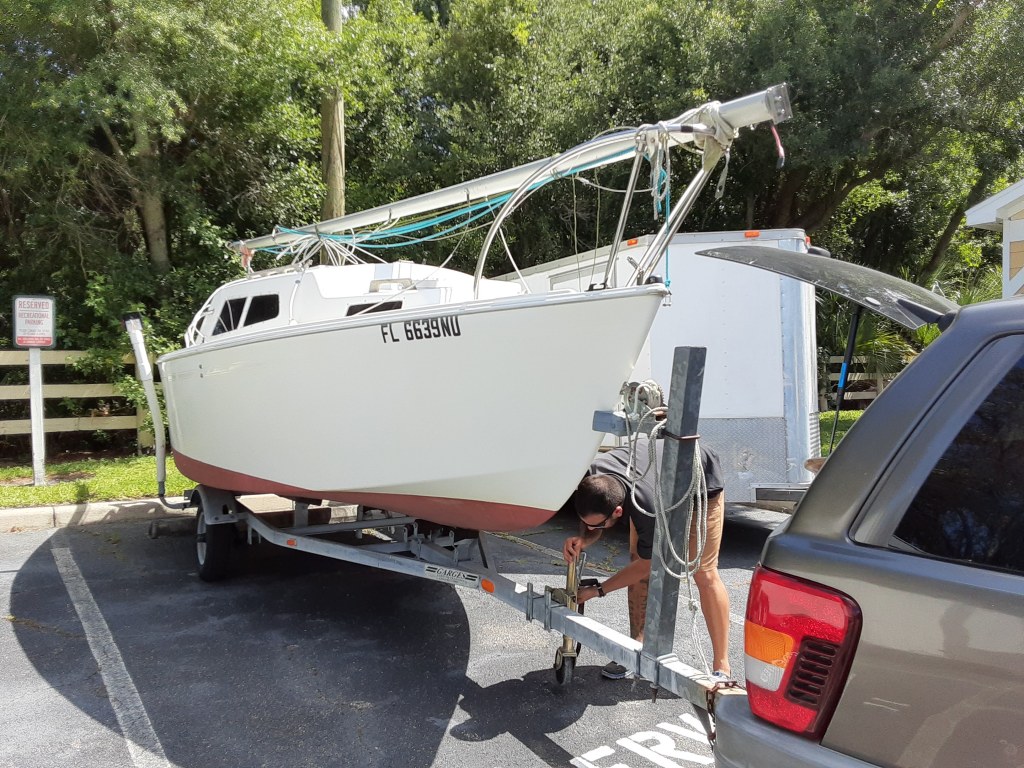 By that time (around 3pm), the marina was bustling like downtown Disney on a holiday weekend. We blocked traffic a few times because the parking lot is one-way and neither of us are fluent is backing up with a trailer. Kept putting it in at an angle that didn’t accommodate the boat. Knocked off the trailer’s other taillight. Thanks to the pity of an experienced onlooker who offered to back up the Jeep and trailer for us, we pulled the boat on to the trailer and drove it out of the water.