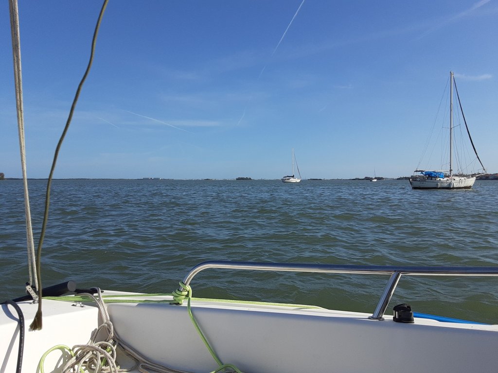 Anton hastily dropped the fin keel from within the cabin, I clambered back aboard, and we motored out to open water and anchored among large anchored sailboats.