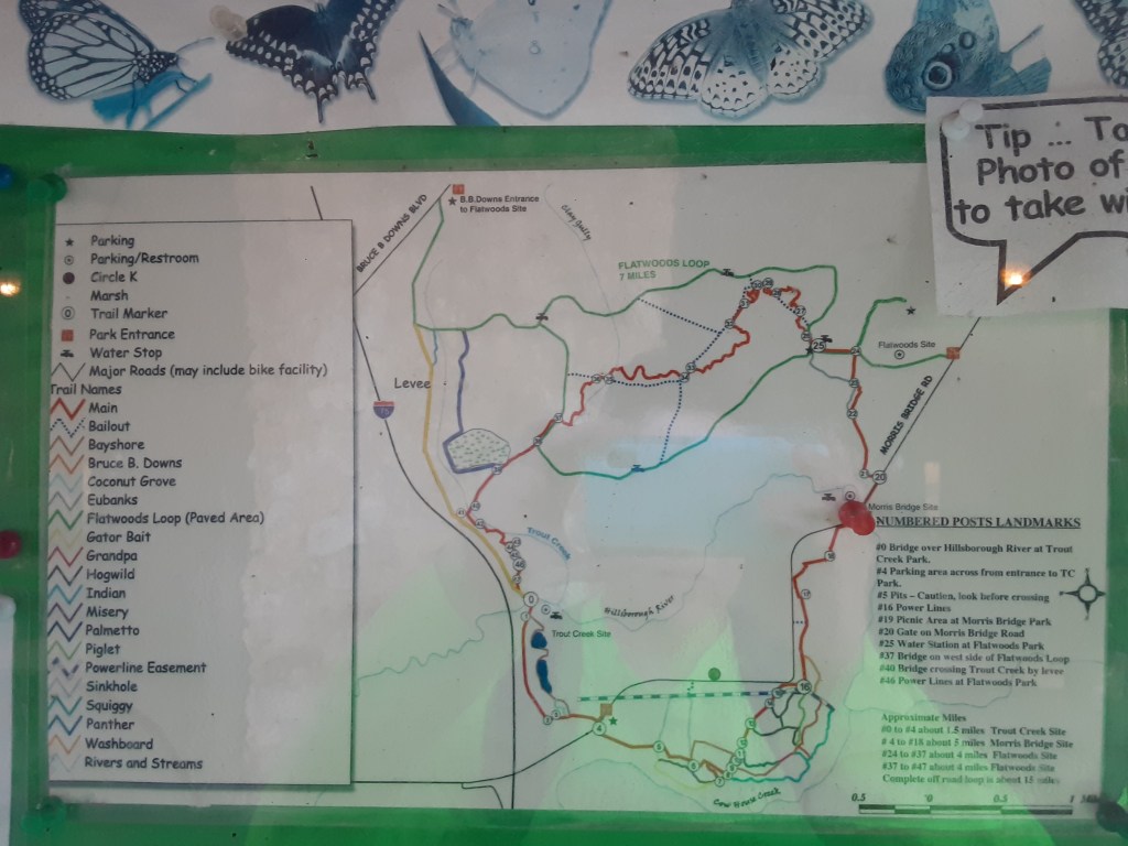 Thonotossasa, FL – I started at the trail head at Trout Creek Conservation Park (mile marker “0” on the map) and hiking north/northeast along the upper half of the 15 mile loop (Hillsborough County, FL).