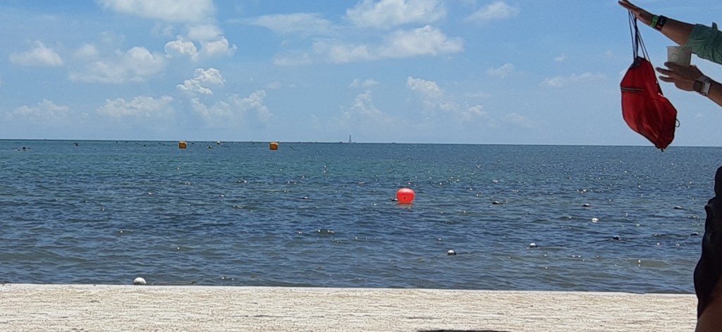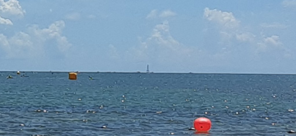 For perspective, the horizon is only 10 miles away. That’s it. That means the lighthouse is visible from shore. Nice, right? The pictures below are from the day before the event where volunteers were setting up the course and Alligator Lighthouse can be seen in the distance.